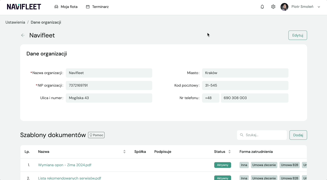 Po odpowiednim przygotowaniu szablonu możesz wgrać go do aplikacji Navifleet Manager. Możesz dodać więcej niż jeden szablon. Aby to zrobić przejdź do zakładki Dokumenty -> Szablony dokumentów i kliknij przycisk Dodaj